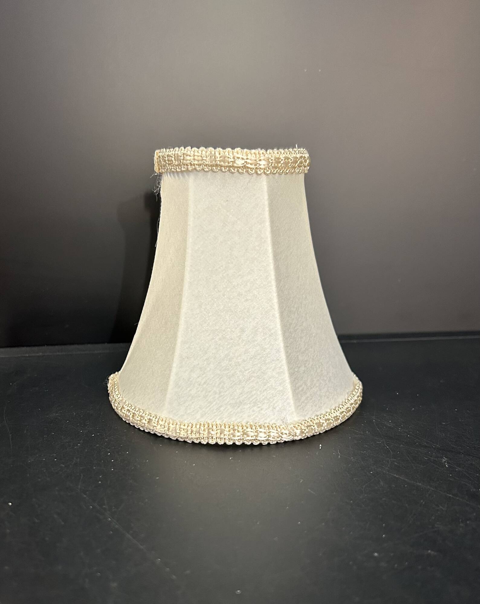 Luonnovalkoisella kankaalla oleva kruunuvarjostin, kullanvärinen koristenauha. Varjostimessa suora ala- sekä yläreuna. Korkeus 12 cm Ylähalkaisija 6 cm Alahalkaisija 12 m Varjostin painetaan...