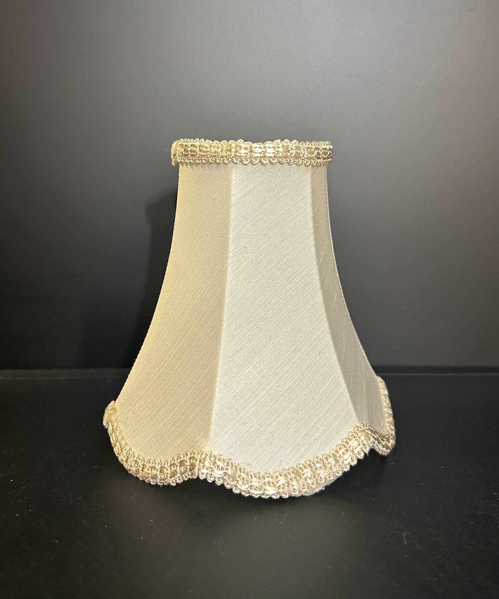 Harmaalla Shantung kankaalla oleva kruunuvarjostin, harmaa koristenauha. Varjostimessa "piparkakku" -reunus alhaalla ja suora yläreuna. Korkeus 12,5cm Ylähalkaisija 6cm Alahalkaisija 12,5cm...