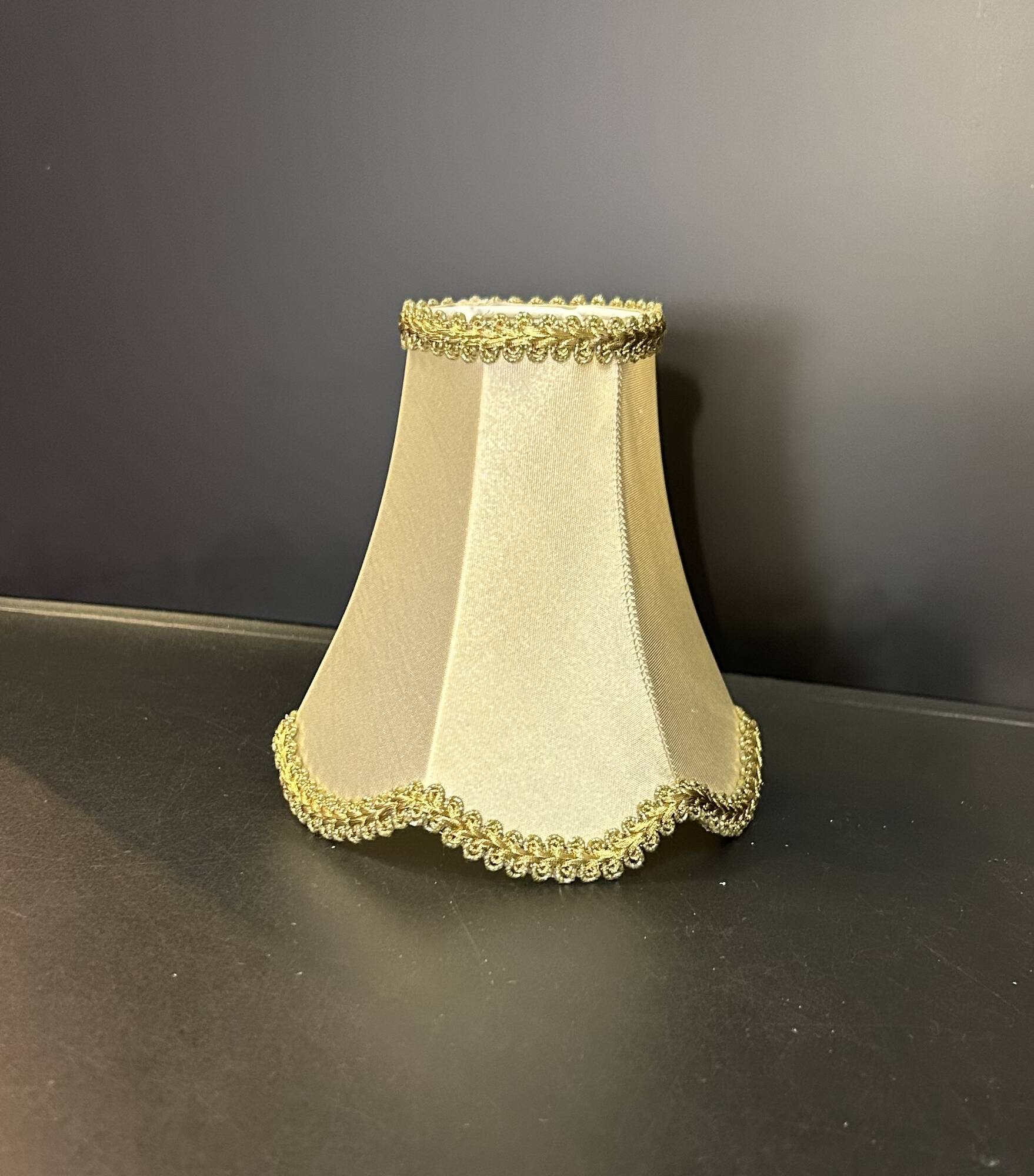 Kullanvärisellä kankaalla oleva kruunuvarjostin. Korkeus 12,5cm Ylähalkaisija 6cm Alahalkaisija 12,5cm Varjostin painetaan kynttilälampun muotoisen lampun päälle.