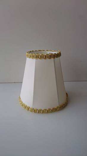 Luonnonvalkoisella kankaalla ja kullanvärisellä reunanauhalla oleva pienikokoinen kruunuvarjostin. Korkeus 10 cm Ylähalkaisija 6cm Alahalkaisija 10cm Varjostin painetaan kynttilälampun muotoisen lampun päälle. Varjostin käy kruunuihin ja lampetteihin.