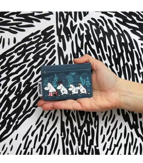 Kaunis, kukkasellinen Muumit Floral - aiheinen korttikotelo. Etupuolella ovat Muumipeikko ja Niiskuneiti ja takapuolella teksti Moomin kukkakuosin päällä. Kotelossa 4 luottokortin kokoista...