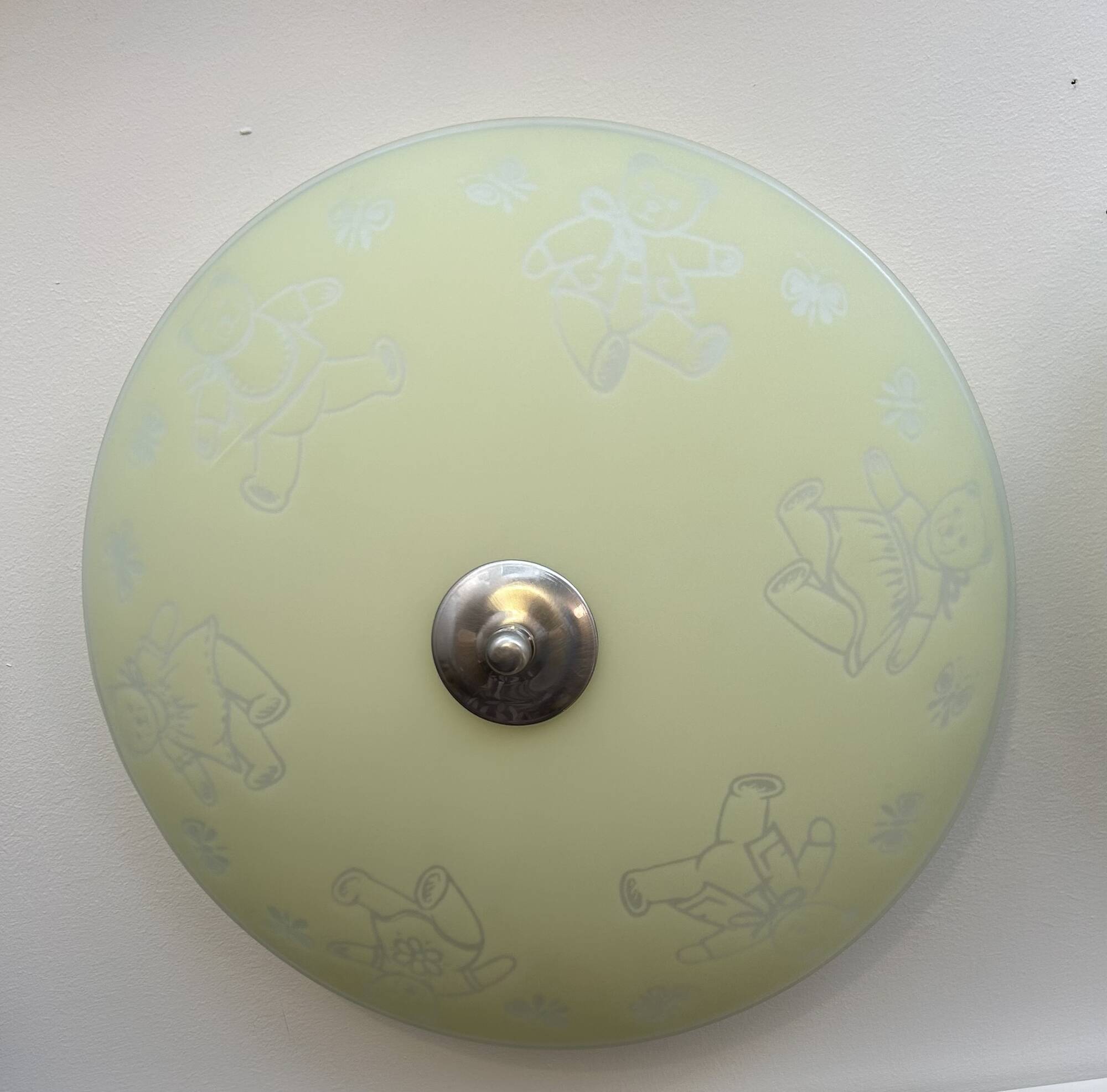 40cm lasiplafondi on kuvioitu nallekuvioilla. Vaalean sininen, mattapintainen lasivarjostin. Koukku- ja pistotulppakiinnitys. 3 x E14 max 40W, ei sisälly. Halkaisija 40 cm Korkeus 16 cm...