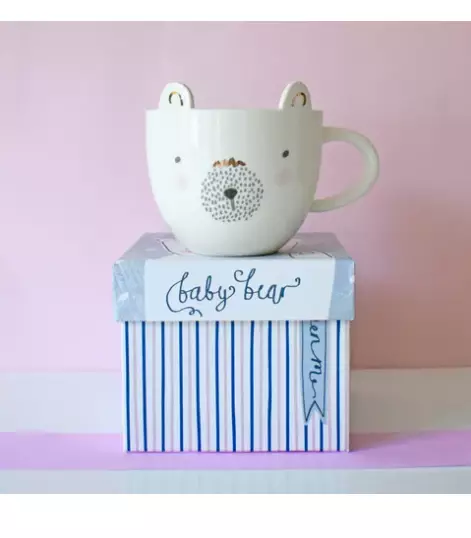 Suloinen, keraaminen Vauva karhu kuppi Over The Moon - sarjasta. Etupuolella on vauva karhun kasvot ja takapuolella teksti 'baby bear'. Kupin reunassa hauskasti vauva karhun korvat. Leveys 11,5 cm Korkeus 8 cm Kuppi on pakattu kauniiseen lahjapakkaukseen.