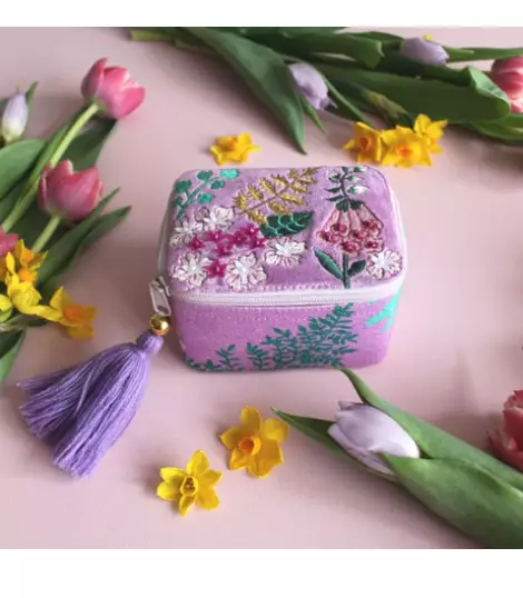 Pieni, pehmeä rasia koruille ja muille pikkutavaroille. Pehmeässä rasiassa korut esimerkiksi matkaavat turvallisesti. Kauniisti koristekirjailtu rasia suljetaan vetoketjulla. Pituus 12 cm Leveys 7 cm Korkeus 8 cm
