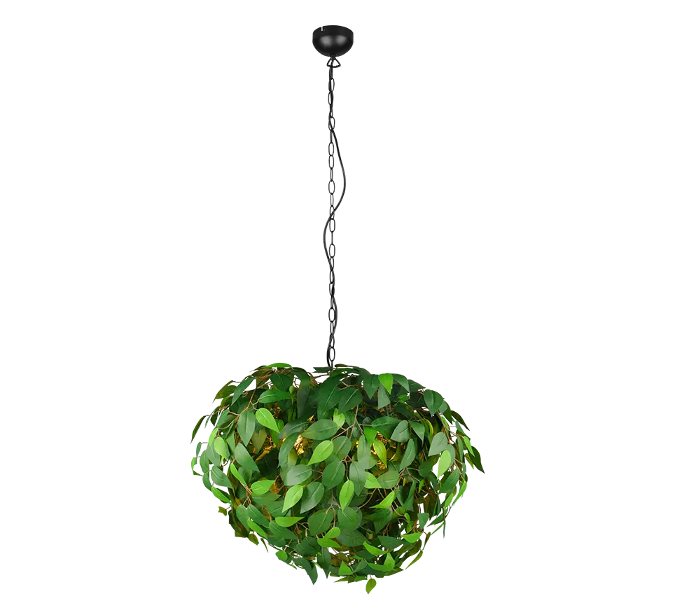 Iso ja näyttävä riippuvalaisin, joka sopii hyvin monenlaiseen tilaan, niin makuuhuoneeseen, lastenhuoneeseen kuin olohuoneeseenkin. Vihreät, hennot lehdet peittävät polttimot ja antavat pehmeän muodon ja näön valaisimelle. Metalliosat mustat. Halkaisija 70 cm. Korkeus 150 cm, ketjun pituuden voi säätää. 4 x E14 max 28W, ei sisälly. Kiinteä asennus. Tuote on kasattava.