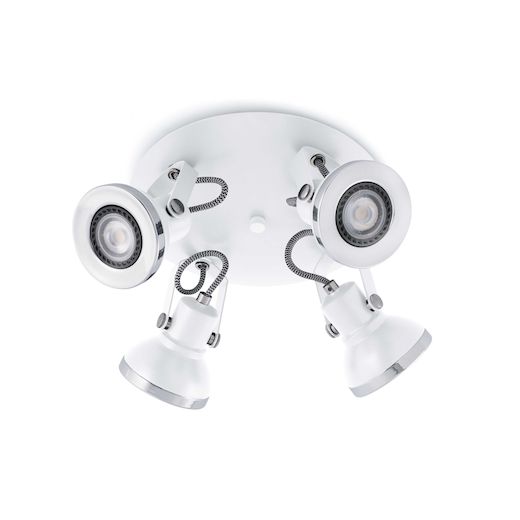 Tyylikäs 4-osainen kohdevalaisin, joka on tarkoitettu Led-lampuille. 4 suunnattavaa spottia pyöreässä pohjaosassa. Valaisin ei vie paljon tilaa, mutta valoa tulee paljon. Valaisin on kohdevalaisin eli valo tulee kohdemaisesti, riippuen polttimon valon avautumiskulmasta. Tällä valaisimella voi korostaa eri kohtia kodissa tai suunnata valo tyhjään seinään, jolloin valo heijastuu huoneeseen yleisvaloksi. Näköä valaisimelle antaa vielä musta/valkoinen kangasjohto jokaisessa spotissa. Valaisin on valkoista metallia, jossa krominvärisiä somisteita. Halkaisija 32cm Korkeus 13cm Kiinteä asennus, suoraan rasiaan. 4xGU10 max 8W, ei sisälly, led-lamput sopivat tähän valaisimeen.