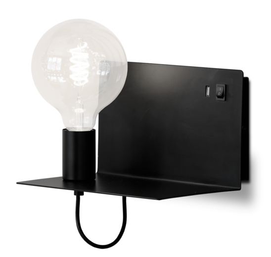 Moderni seinävalaisin hyllyllä ja lataavalla USB-portilla. Pelkistetyn muodon ansiosta valaisimeen saa näyttävyyttä erilaisilla lampuilla. Katkaisija on kätevästi rungossa. Valaisin sopii hyvin esimerkiksi sängyn viereen, nuorten huoneeseen tai eteiseen. USB-portista lataat esimerkiksi puhelimen kätevästi yön aikana. Musta metallirunko Korkeus 15 cm Syvyys 18 cm Leveys 25 cm 1 x E27 max 10W, ei sisälly. Johdon pituus 1,8 m