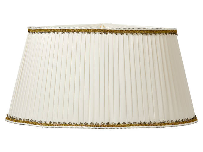 Kaunis, pliseeratulla vekillä tehty pyöreä kangasvarjostin, joka sopii hyvin esimerkiksi antiikkisiin 2- tai 3- osaisiin lattiavalaisimiin. Varjostin tulee kiinni yläosassa olevaan 10mm reikään. Alahalkaisija 50 cm Ylähalkaisija 40 cm Korkeus 25 cm Vaalea beige, luonnonvalkoinen kangas. Kullanvärinen koristereunanauha.