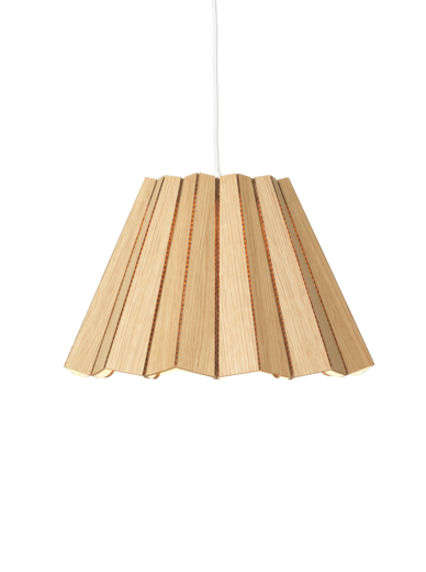 Kotimainen aaltopahvista valmistettu hamemallinen varjostin, jonka saa riippuvalaisimena useassa kokoluokassa ja seinävalaisimena. Pintamateriaalia on pahvista vaneriin. Tässä valaisimessa on tammenvärinen, vanerinen ulkopinta, sisäpinta on valkoinen pahvi. Hame- valaisimen taitoksista näkyy aaltopahvin leikkauspinta ja kun valaisimessa on valo päällä, muodostuu valosta helminauha. Valaisin on koottava ja on suunniteltu pieneen tilaan mahtuvaksi toimituksessa sekä säilytyksessä. Suunnittelija andbros (Antti-Jussi Silvennoinen & Pekka Kuivamäki) Halkaisija 40 cm Koukku- ja pistotulppakiinnitys, pistotulppa ei sisälly. 1 x E27 max 28W, ei sisälly.