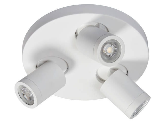 Moderni 3-osainen kohdevalaisin kosteaan tilaan, voi laittaa myös kuivaan tilaan. Valo-osaa voi suunnata haluttuun suuntaan, mutta jos valotarve on vain alaspäin, valaisimen jalka piiloutuu kauniisti valaisimen sisään alaspäin kohdennettuna. Valkoinen metallirunko. Kiinteä asennus. Halkaisija 25 cm Korkeus 11 cm 3 x GU10 max 35W, ei sisälly. Kotelointiluokka IP44