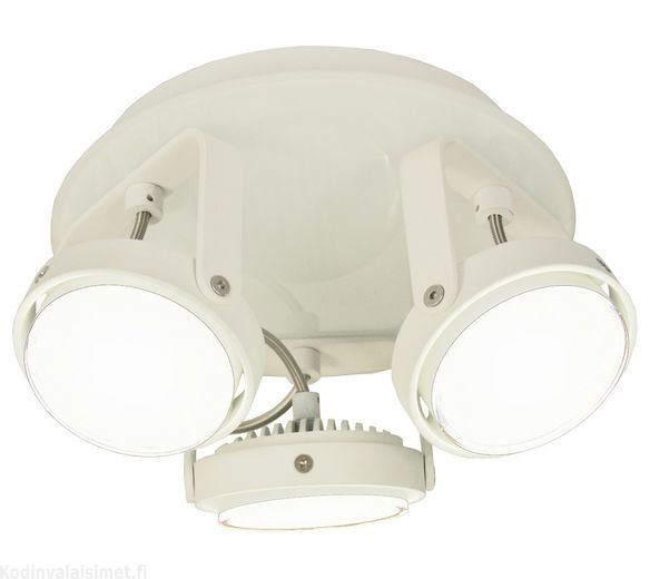 3-osainen kohdevalaisin, joka sopii myös kosteaan tilaan. Valkoinen metallirunko. Valo-osia voi suunnata eri suuntiin. Korkeus 11,7cm Halkaisija 22,4cm Kiinteä asennus. 3 x 4,8W LED (sisältyy), 350 lumen/kpl, tarvittaessa vaihdettavissa. Lämminvalkoinen led, 3000K. Arvioitu paloaika 25 000h. Ei himmennettävä. Kosteusluokitus IP44.