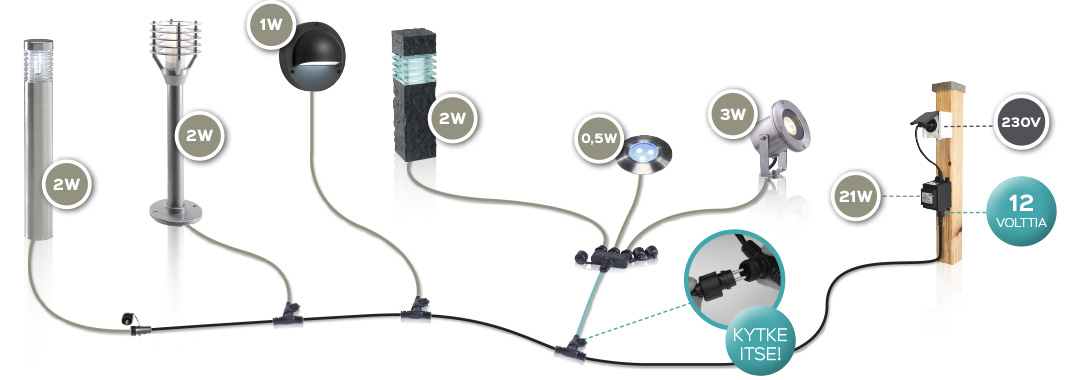 Valitse haluamasi valaisimet laajasta valikoimastamme. Voit valita niin monta valaisinta kuin haluat noin 50 tunnelma-, terassi- ja puutarhavalaisimen valikoimastamme ja yhdistää vapaasti kaikkia valaisimia keskenään samaan muuntajaan. Yhdellä muuntajalla voi tehdä pisimmillään jopa 80 metriä pitkän kaapeloinnin.