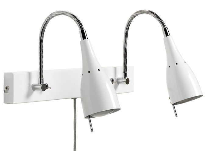 2-osainen suunnattava seinävalaisin. Valkoinen/kromi metalli 2xmax 40W R50 E14 (ei sisälly), kohdemalliset lamput sopivat tähän valaisimeen. Suosittelemme led-lamppua. Molemmille lampuille oma katkaisija rungossa Seinäkiinnitysosan korkeus 6 cm Leveys 40cm Syvyys max 37cm