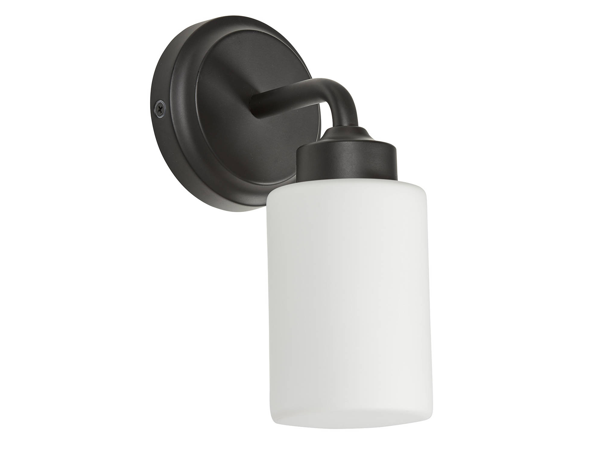 Retromallinen seinävalaisin modernissa, mustassa runkovärissä. Matta musta metallirunko ja valkoinen opaalilasikupu. Valo tulee valkoisen lasikuvun läpi miellyttävästi ja tasaisesti. Valaisimen voi asentaa ylös- tai alaspäin ja kuivaan tai kosteaan tilaan. Kosteusluokitus IP44 1 x E14 max 40W, ei sisälly. Korkeus 22 cm Leveys 10 cm Syvyys 14 cm Kiinteä asennus.