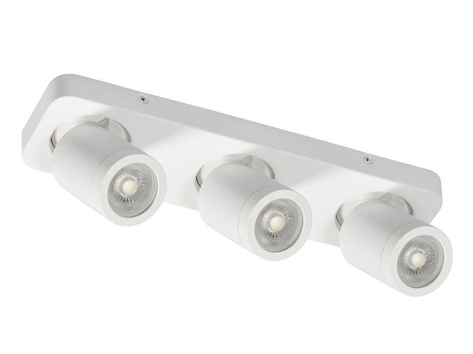 Moderni 3-osainen kohdevalaisin kosteaan tilaan, voi laittaa myös kuivaan tilaan. Valaisimen voi asentaa sekä katto- että seinäpintaan. Valo-osaa voi suunnata haluttuun suuntaan, mutta jos valotarve on vain alaspäin, valaisimen jalka piiloutuu kauniisti valaisimen sisään alaspäin kohdennettuna. Valkoinen metallirunko. Kiinteä asennus. Pituus 35 cm Syvyys/korkeus 11 cm 3 x GU10 max 35W, ei sisälly. Kotelointiluokka IP44