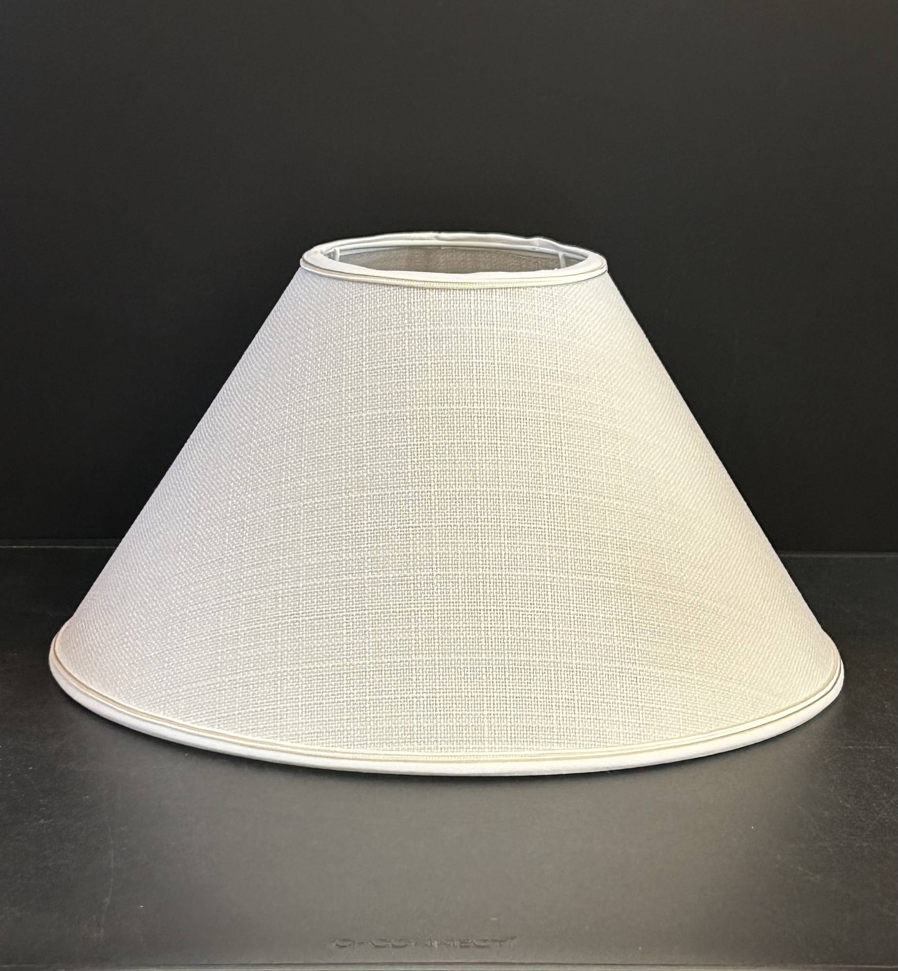 Luonnonvalkoinen pellavakangas läpinäkyvän kovikemuovin päälle laminoituna. Varjostimen alahalkaisija 30 cm Varjostimen ylähalkaisija 14 cm Viisto korkeus 20 cm Varjostimessa kiinteä E27...